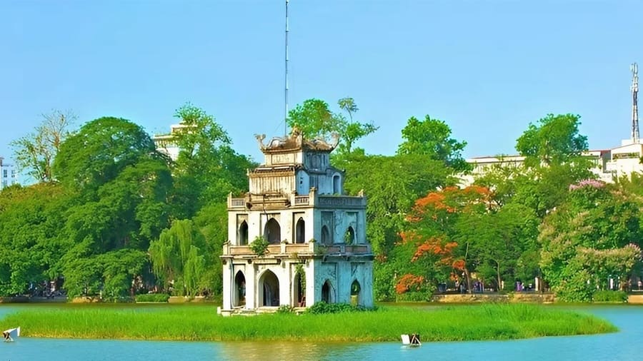 Hoan Kiem Lake serves as the geographical and cultural center of the city. Accessing the Ngoc Son Temple requires crossing the bright red Huc Bridge, an ideal location for morning photography before the heavy crowds arrive at 9:00 AM. Entry to the temple island costs 30,000 VND, and you must cover your shoulders to pass the front gate guards.